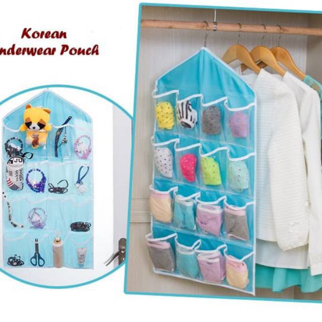 Dengan Korean underwear pouch, celana dalam jadi tersimpan rapi dan mudah diambil saat hendak dipakai.Pouch terdiri dari 16 sekat transparan, tiap sekat dapat di isi 3-4 pcs celana dalam. Pouch dapat digantung ke hanger, mumudahkan untuk digantung di dalam lemari. Bagian atas terdapat lobang untuk hanger.Selain untuk tempat panties, pouch juga dapat digunakan untuk tempat menyimoan aksesoris. Dengan sekat yang cukup banyak, bisa diisi dengan aneka aksesoris seperti kalung, gelang, anting dan pernak pernik lainnya.Material : Polyester anti air. Sekat bahan plastik transparanSize : +/- 42 x
