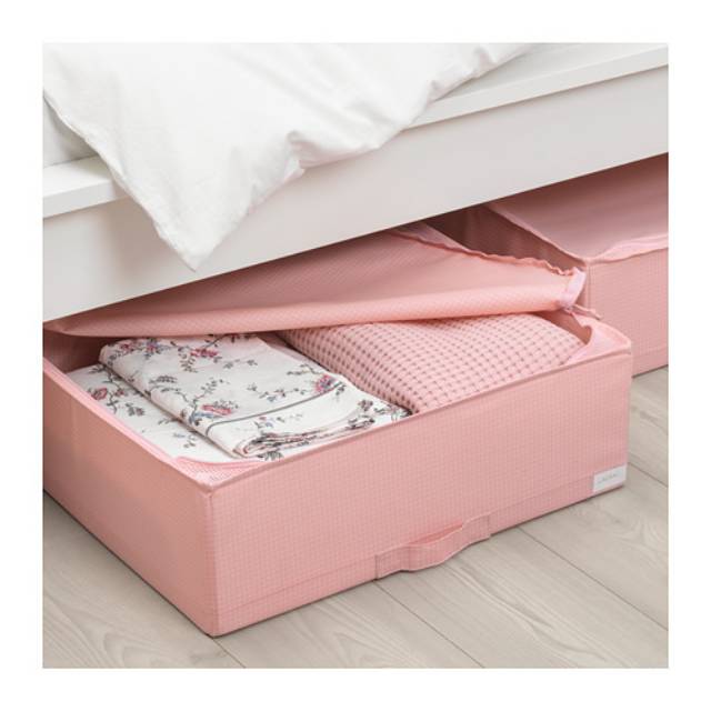 Melindungi pakaian anda dari debu.Anda dapat menyimpan kotak penyimpan di bawah tempat tidur - cocok untuk menyimpan sprei, bantal dan selimut cadangan.Pakaian dan tektstil yang disimpan segar lebih lama, karena jaring ventilasi di sudut memungkinkan udara bersikulasi.Tempat label membantu mengatur dan menemukan barang Anda.Mudah ditarik keluar dan diangkat karena kotak memiliki pegangan.Tidak memakan banyak ruang untuk menyimpan karena dapat dilipat rata.Tempatkan dalam lemari pakaian atau selipkan di bawah tempat tidur - penyimpanan praktis untuk pakaian musiman atau quilt yang juga melindungi dari debu. Gunakan dengan produk STUK untuk pengaturan lengkap ruang penyimpanan