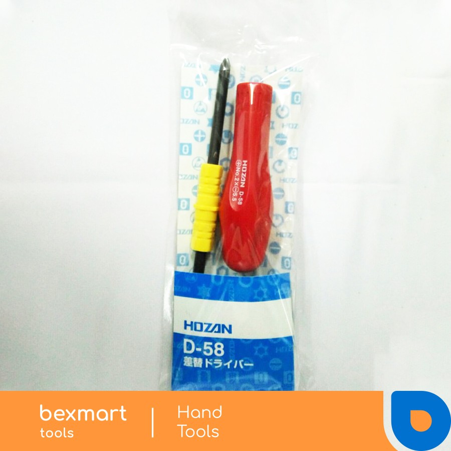 Hozan D58 ( Driver/Wrench ) ORI JEPANG- Tip size mm : (+)No.2 / (-) 5.5 x 0.9- OAL mm : 181- Blade length mm : 60 + 60- Blade diameter mm : 6- Handle diameter mm :