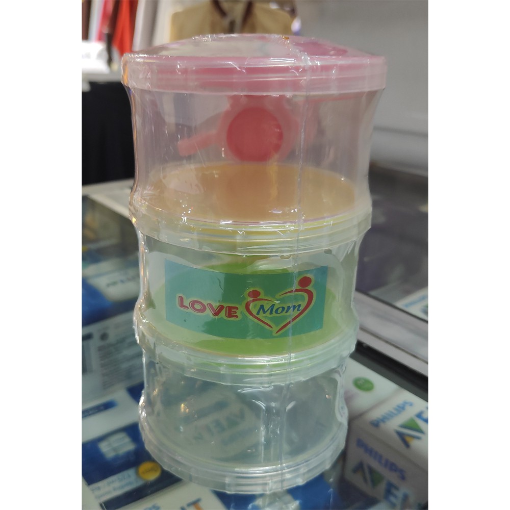 Lovemom Milk ContainerTempat wadah penyimpanan susuLove Mom Container Susu 3 SusunTempat susu bubuk yang praktis dan mudah di bawa kemana-mana. Terdiri dari 3 tingkat yang dapat menampung susu bubuk sebanyak 90 gram susu bubuk setara dengan 3 sendok takar susu kaleng.Kelebihan:- Terbuat dari Polypropylene (PP) yang tidak beracun dan tidak mengandung Bisphenol-A (BPA Free)- Plastik dan pewarna Food grade.- Tutup rapat dan kencang.- Dapat di lepas sesuai dengan kebutuhan.- Terdapat corong yang memudahkan pemindahan susu bubuk ke botol.#Lovemom #Container #SusuBayi #IDOLA #BabyShop #IdolaBabyShop #Slaber #Libby #KAZEL #BajuTidurBayi #P