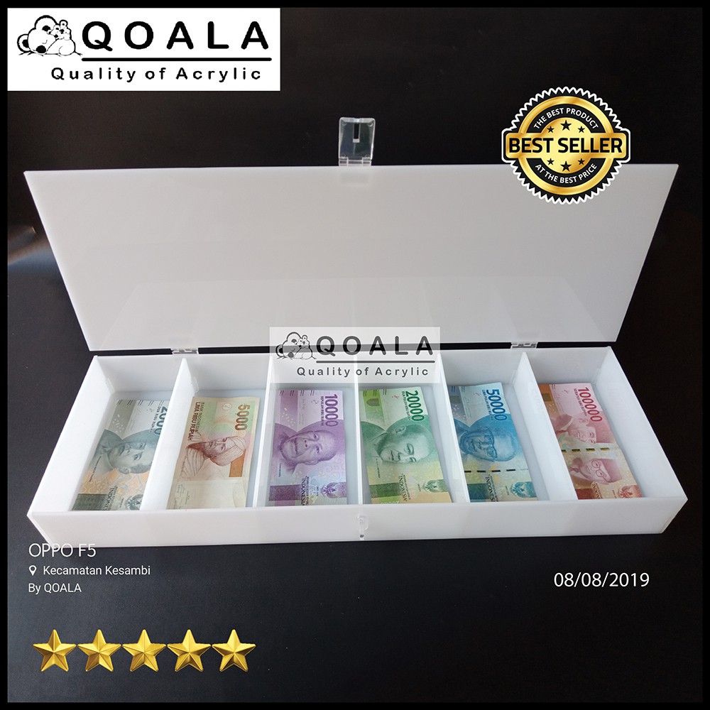 Ukuran barang bagian dalam : 48cm x 16cm x 4,8cm (bahan 2mm) dan 48cm x 16cm x 4,7cm (bahan 3mm)Ukuran barang bagian luar : 48,4cm x 16,4cm x 5cm (bahan 2mm) dan 48,6cm x 16,6cm x 5cm (bahan 3mm)Ukuran paket : 52cm x 20cm x 9cmTerbuat dari bahan acrylic putih susu dengan pilihan ketebalan bahan 2mm dan 3mm.Manfaat dari produk ini bisa digunakan untuk merapihkan dan mempercantik tampilan bagian dalam laci kasir tempat usahamu agar lebih rapih dalam penataan penyimpanan uangnya. Dan minim resiko kerusakan akibat umur dan suhu ruang, bahkan jika terjadi bencana alam seperti banjir juga tempat uang acrylic ini tidak akan rusak dengan mudah.Produk ini juga bisa dimanfaatkan untuk tempat penyimpanan lainnya sesuai kebutuhan.“TEMPAT UANG YANG KECE, YANG BISA MEMBANTUMU MERAPIHKAN UANG DI KANTOR ATAU TEMPAT USAHAMU YANG KECE JADI MAKIN KECE”Produk ini terkena berat volume, bukan berat aslinya.Untuk ukuran lain bisa custom via chat.Catatan :-Harga barang sudah termasuk packing aman menggunakan kotak sterofoam lembaran setebal 2cm.-Disarankan menggunakan jasa kurir yang paling cepat sampai dan membeli produk tambahan packing kardus di toko kami untuk mengurangi resiko kerusakan.Link produk tambahan packing kardus : https://shopee.co.id/TAMBAHAN-KARDUS-PACKING-i.4918911.7422810163-Barang sudah dicek sebelum pengiriman, jika ada kerusakan akibat pengiriman diluar tanggung jawab