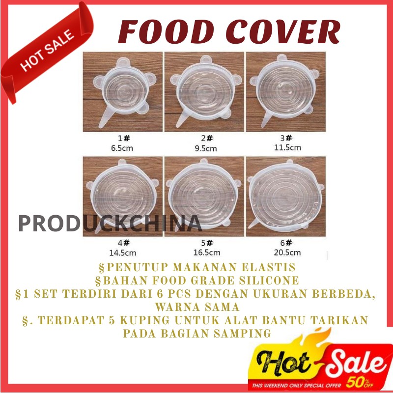 Selamat belanja di toko Kami,barang 99% ready stock silahkan langsung Masukan keranjang,jangan lupa konfirmasi pembayaran, proses cepat, barang berkwalitasready BIRUApakah makanan yang disimpan di kulkas jadi cepat kering akibat tidak tertutup rapat??Apakah makanan yang di meja makan mudah kemasukan lalat atau kecoak akibat tidak tertutup rapat??Apakah sisa makanan yang disimpan di kulkas aromanya jadi berubah akibat tidak ditutup rapat??Apakah anda sering repot mencari tutup piring yang pas saat makanan hendak disimpan di dalam kulkas atau saat makanan tersaji di meja makan??Hal- hal di atas sering terjadi pada makanan yang tidak habis dimakan atau makanan yang belum sempat dimasak.Namun, kini semua hal di atas dapat diatasi dengan 6 in 1 food cover. Food cover adalah penutup makanan elastis dari bahan food grade silicone, tidak berbau, aman untuk makanan. 1 set terdiri dari 6 pcs food cover dengan ukuran berbeda, warna sama.Food cover sangat elastis, ditarik akan melar. Terdapat 5 kuping untuk alat bantu tarikan pada bagian samping food cover. Jika tertarik rapat cairan yang di dalam juga gak bakal tumpah.Food cover bisa dipakai pada piring, gelas, mangkok, botol dan sejenisnya dengan spesifikasi ukuran masing-masing food cover sbb :- XS : 6.5 cm- S : 9.5 cm- M : 11.5 cm- L : 14.5 cm- XL : 16.5 cm- XXL : 20.5 cmDengan food cover, makanan jadi tetap fresh dan awet. Anda tidak perlu lagi mubajir akibat membuang makanan yang rusak atau busuk. Kesegaran makanan tetap terjaga berkat food cover. Pemakaian sangat mudah dan praktis, bahan mudah dicuci dan disimpan.Cantumkan Warna Ukuran Dan Motif cadangan Di Catatan Order,Bila Warna yang Diminta Kosong,Kami Akan Kirim Random.Atau Tulis Kosong=C