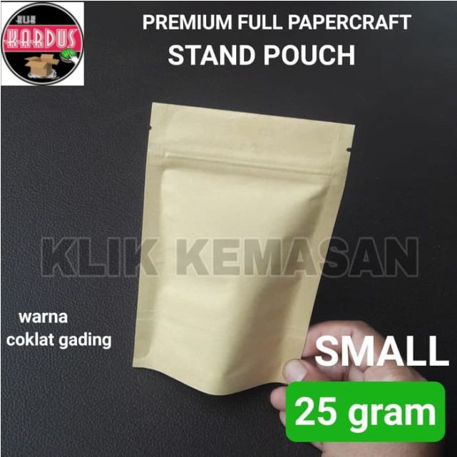 STAND POUCH KRAFT 25 GR PREMIUM/KEMASAN KOPI SNACKKemasan Stand Pouch kraft MINI kapasitas 25 gram.Sangat cocok untuk kemasan produk Anda dan UKMStand pouch Mini 25gramBahan Kraft coklat gadingKetebalan 200 mgBahan Food gradeUntuk kemasan 25 gram biji kopi.Atau bisa 50 gram gula pasir.Size 8x13 cmDilengkapi Zipper/Klip jadi mudah menutup dan membuka.Bagian bawah model stand pouch jadi produk akan tegak berdiri.Bagian dalam dilapisi alufoil sehingga produk tidak merembes keluar.Sangat cocok untuk kemasan produk kecil:Kemasan kopiKemasan SnackKemasan UKM yg lainKemasan ImportBerat 400 gram/pack isi 100 pcsCara mengukur kemasan yg dibutuhkan:1. Pengukuran kemasan kami menggunakan beras dan gula pasir dengan granule/butiran berat. Jadi bentuk bubuk akan punya volume lebih besar dari bentuk butiran gula. Jadi membutuhkan kemasan lebih besar untuk bubuk dan biji dengan berat yang sama.2. Barang yang sudah dibeli tidak dapat dikembalikan ataupun ditukar. Jadi pastikan dengan benar ukuran mana yang akan Anda beli.#standingpouch #standpouch #kemasankopi #kemasansnack #kantongkertas #kemasan #kopi #coffeebag #plastikklipberdiri #standpouchkraft #cetakkemasan #printing #gusset #gussetkopi #paperbag #kopi #roasted #kopibubuk #susububuk #cappucino #coffeebag #flatbottom #paperbag #plasti