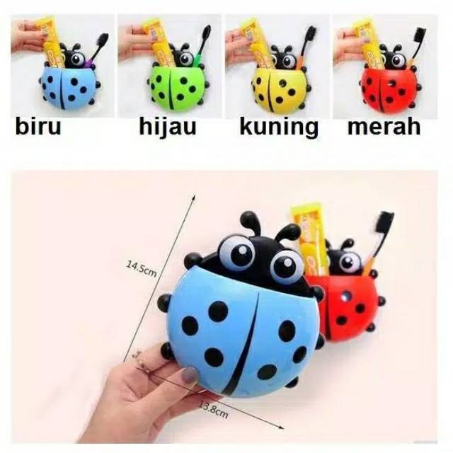 Harga adalah harga satuan, BUKAN harga perset 4 warnaHolder unik berbentuk kumbang yang nempel di dinding. Pasangnya tanpa paku, tanpa bor keramik. Tempelan model karet hisap.Fungsinya untuk tempat sikat gigi, odol, sisir, kosmetik dan pernak pernik. Tampilan kamar mandi jadi unik.Cara Pasang :- Lap bersih permukaan kaca atau keramik yang hendak dipasang, lalu keringkan- Lap bersih permukaan karet hisap, lalu keringkan- Tempelkan holder ke kaca atau keramik, lalu tekan hingga holder nempel kuatMaterial : PlastikSize : 16.5 x 14