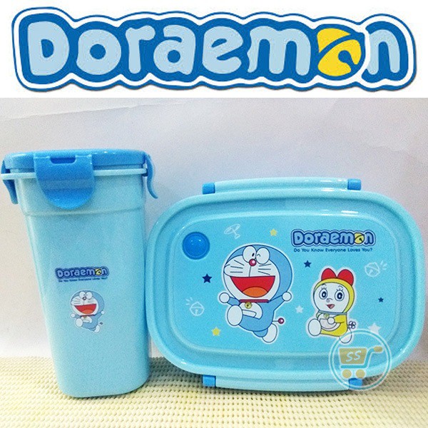 Tempat bekal set dengan gambar doraemon yang sangat cute. Tempat bekal doraemon ini terdiri dari kotak makan berukuran 17.5x12.5x7cm dengan tutup knock down berwarna biru muda dengan gambar doraemon lagi bergembira. Dilengkapi dengan botol minum berbentuk gelas berwarna biru muda yang juga bergambar doraemon lagi asik dengan tutup berwarna biru juga di bagian atasnya, berukuran tinggi sekitar 16cm dengan diameter 6cm. Ditambah lagi sudah ada garpu kecil dan tas spundbond nya.
