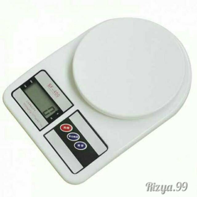 SEMUA FOTO YANG DIPAJANG ADALAH FOTO ASLI DARI BARANG YANG DIJUAL.BARANG AKAN SELALU DICEK SEBELUM PENGIRIMAN.PEKING INSYAALLAH AMANAH KAMI KE PUASAN ANDA.Timbangan Kue / Dapur SF-400 Digital Kitchen Scale10kg.Kelebihan Timbangan digital ini dibanding dengan timbangan konvensional :* Berteknologi High Precission Strain* Tampilan LCD dengan angka yang besar sehingga mudah terbaca.* Power: 2 x Baterai AA 1,5 volt (sudah termasuk)* Overload / Low battery indicator* Auto zero resetting.* Auto Power off (Mati sendiri bila tidak digunakan)Langkah-langkah menimbang dengan menggunakan wadah / media penampung (mangkuk,gelas dll) adalah sbb:- Letakkan timbangan pd tempat yg datar & diam- Hidupkan power timbangan hingga LCD tampil nol- Letakan wadah diatas plate bundar timbangan- Tekan tombol TARE hingga angka nol- Siap untuk menimbang.Mohon menanyakan terlebih dahulu sebelum memesan untuk ketersediaan stok ... Terimak