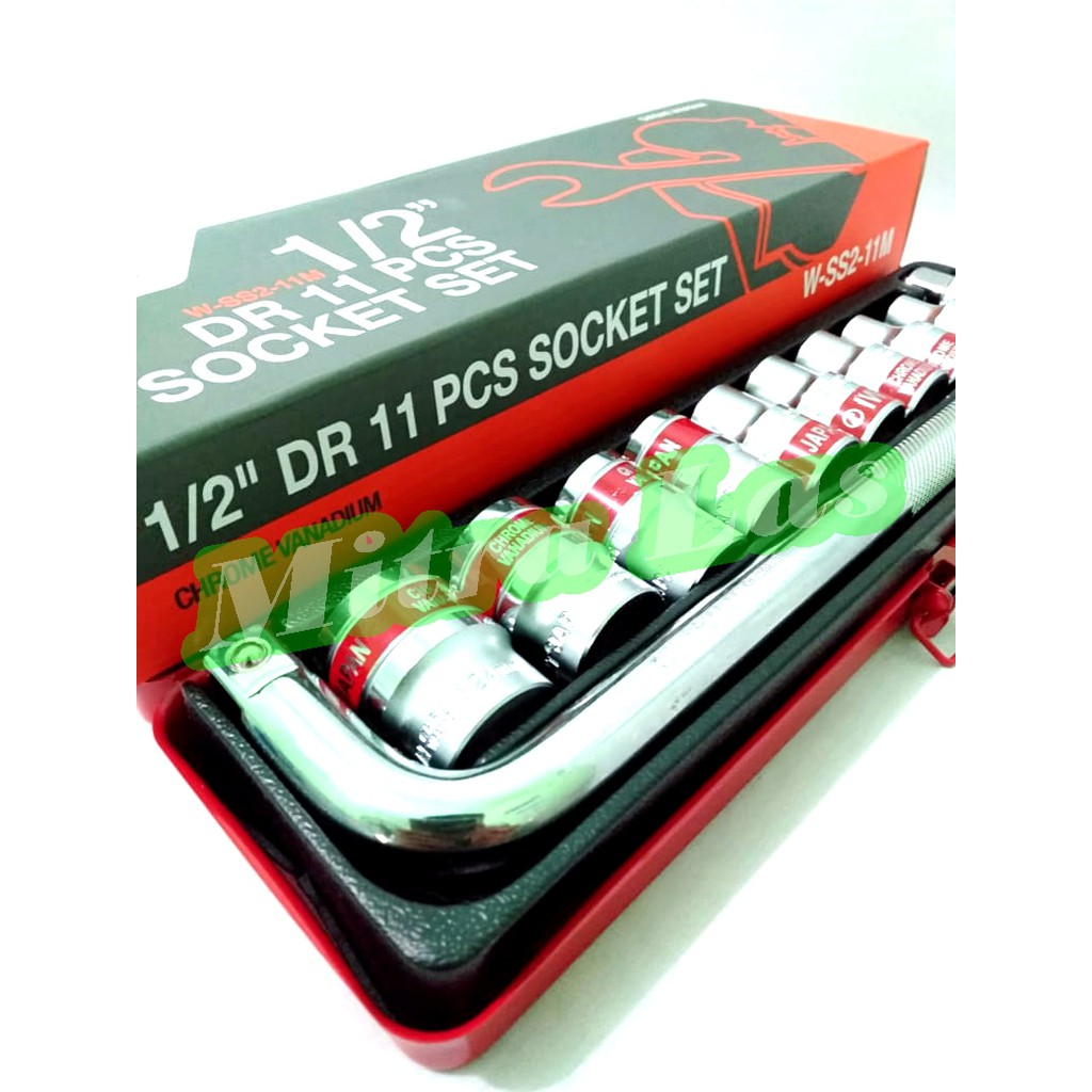 Socket set yg dilengkapi handle sok L 10",Mata sok 8mm, 10mm, 12mm, 13mm, 14mm, 17mm, 19mm, 22mm, dan 24mmMerek : IWTUkuran 1/2"Tipe : W-SS2-11M (12