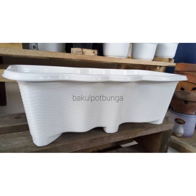 Pot bunga panjang SGP 05 warna PUTIH dengan model unik sangat cocok untuk tanaman hias yang diletakkan didalam maupun diluar ruangan serta dengan kualitas bahan yang tebal dan awet Diameter panjang 50cm Tinggi 17cm Lebar 2